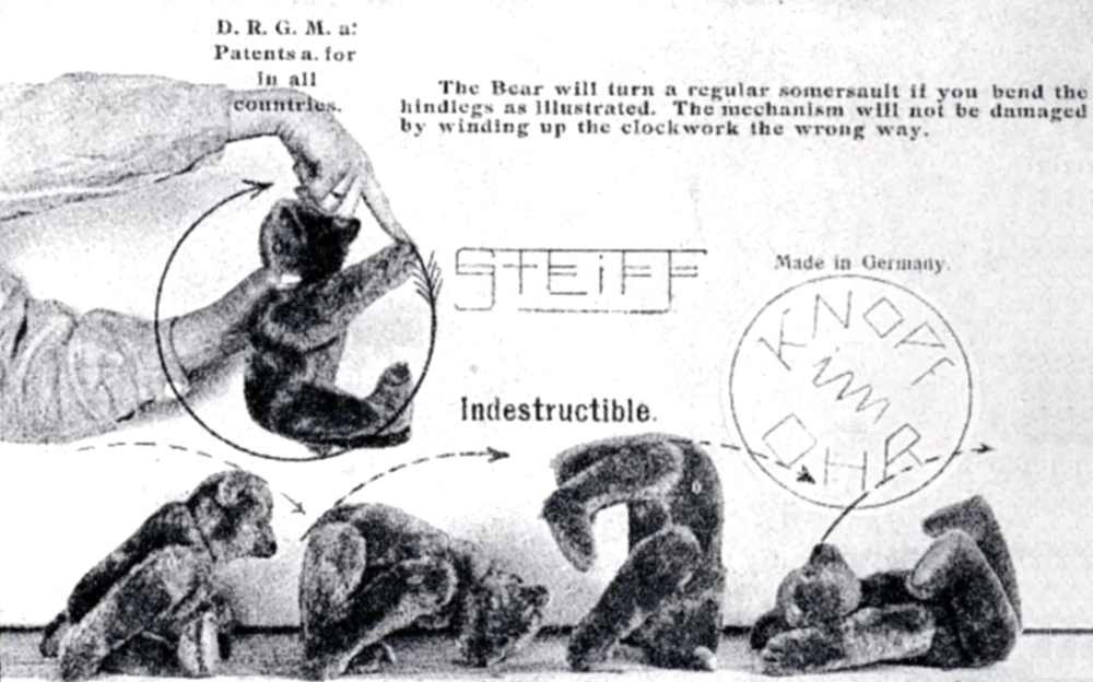 Der Steiff Purzelbär kam um 1909/1910 auf den Markt und gilt als erster „aktiver“ bzw. mechanischer Teddybär von Steiff.  Er wurde mit einem eingebauten Uhrwerk bzw. Schwungradantrieb ausgestattet, das – ähnlich wie beim konkurrierenden „Acro-Bären“ der Firma Bing – durch Drehen eines Armes aufgezogen wurde und den Bären zu Purzelbäumen bzw. akrobatischen Bewegungen veranlasste. Produziert wurde der Purzelbär nur wenige Jahre, etwa von 1910 bis 1916, und gehört heute zu den frĂĽhen, gesuchten Raritäten der Steiff-Geschichte.